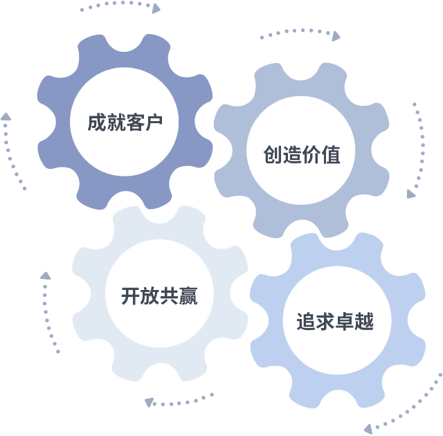 成就客户是一切决策的出发点,,创造价值是衡量所有工作的标准,,追求卓越是我们做事做人的态度,,开放共赢是我们的格局也是最终的结果。。。。价值观的齿轮环环相扣,,,,推动着组织里的每个人不断向前。。。。